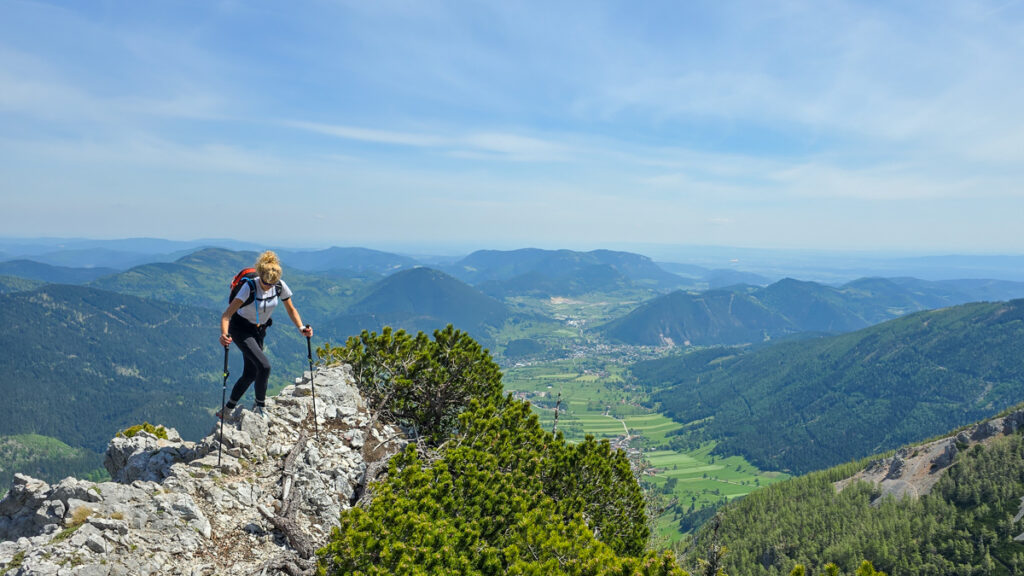 Der Novembergrat ist nur anfangs vom Windbruch betroffen. Bald sind wir über Wald- und auch Baumgrenze. Der Steig ist nicht immer leicht zu finden. Bleibt man am Grat, kann aber nicht viel schiefgehen. Weiter oben werden meines Erachtens die Markierungen wieder reichlicher. Blass sind sie allemal.