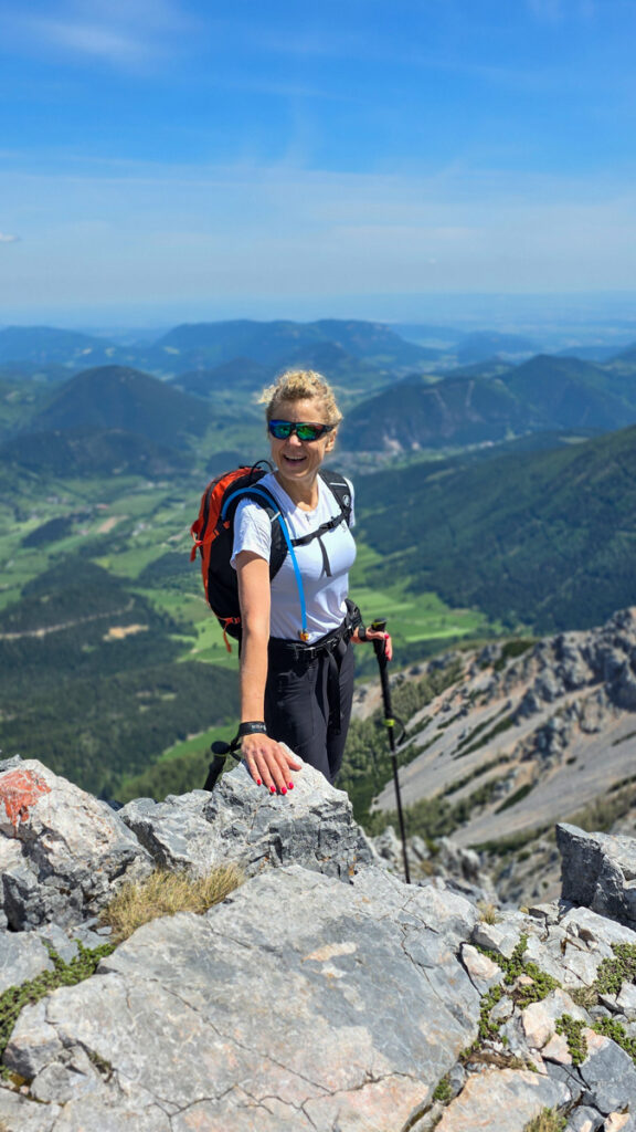 So, jetzt noch zum Kaiserstein. Die Portale sind im Schnelldurchgang zurückerobert und weiter geht’s zum Damböckhaus, wo Renate schon wartet. Schon am Weg zum Gipfel ist ihr Mio abgehauen und hat sich mit Genuss in Gülle – ja, auch die hat irgendwie da heraufgefunden – gewälzt. Er stinkt in kaum auszuhaltendem Ausmaße. Die Hütte wurde renoviert und ist gerade in Fertigstellung. Schön ist es geworden, wirklich überraschend fein. Auch das Essen ist sehr gut. Renate meint gar, dass es der beste Topfenstrudel auf einer Hütte ever war. Wäre da nur nicht Mio, der bei jeder Bewegung einen Schwall loslässt, der einem den Atem raubt. Zum Glück schläft er. So ein Genießer!