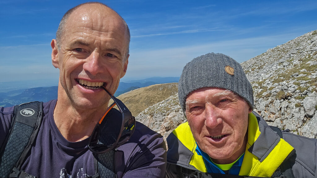 Ich zische los, soweit man da von Zischen reden kann. Knapp vor der Hütte sehe ich Gernots Vater. Ich rufe: „Norbert!“. Da wundert sich jemand. Noch ein paar Meter näher und noch einmal: „Norbert!“. Wieder sehe ich erstauntes Kopfdrehen, aber dann erkennt er mich und lacht. Er hat sich die Zahnradbahn gegönnt und ist zur Fischerhütte aufgestiegen. Jetzt geht es wieder zum Bahnhof zurück. Tapfer! Ein Selfie schießen wir.