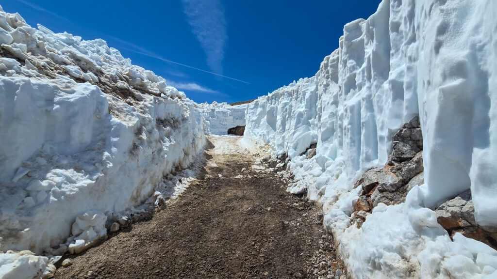 Der Aufstieg durch den Schneidergraben ist erwartungsgemäß zäh. Renate hängt am letzten Teil des Grabens gar schon an den Stöcken, ein wahrlich ungewohnter Anblick.