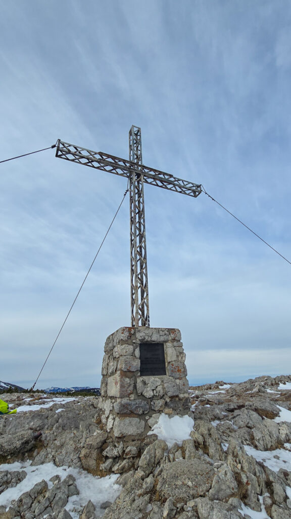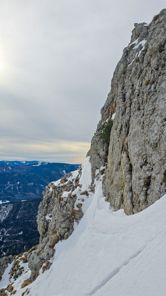 So schwitzen wir den Thörlweg hinauf. Oben liegt dann tief Schnee. Schneerutsche unterschiedlicher Größe haben ihn weg- oder zusammengeschoben. Die Schuhwahl war korrekt. An eine Skitour ist nicht zu denken. Am Plateau dann wildester Bruchharsch. Da wäre man mit Skiern zumindest im Aufstieg besser dran, aber abfahren magst du da nicht.