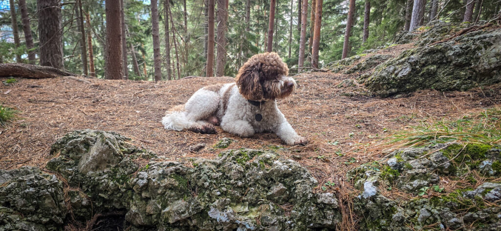 Runter sind wir dann die ersten seit den letzten Schneefällen, die den Gsohlhirnsteig gehen. Mio springt und versinkt. Bergab hält er das aus und hat Freude am Abstieg. Auch für uns ist der Abstieg im Schnee angenehm. Im Wald dann noch ein bisserl Eis, ehe es aper wird und die Schneerosen übernehmen. Die werden sich bald nicht mehr bei in unseren Breiten halten. Oder sollen sie im November blühen?