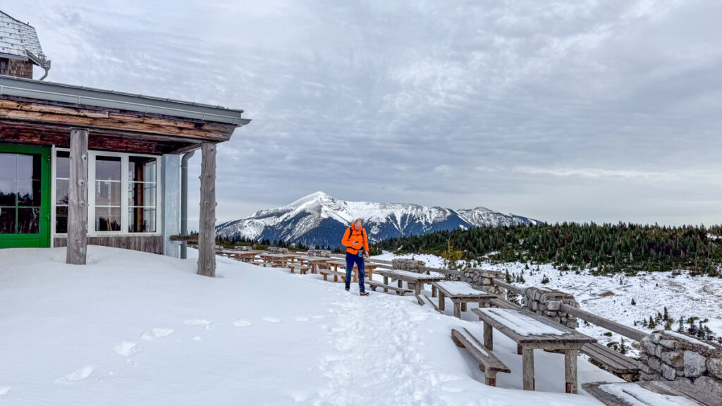 Wir erreichen das Otto-Haus und besteigen den Jakobskogel. Weiter geht es zur Bergstation der Rax-Seilbahn. Nix los, weit und breit. Leider ist auch die Menüauswahl sehr eingeschränkt.