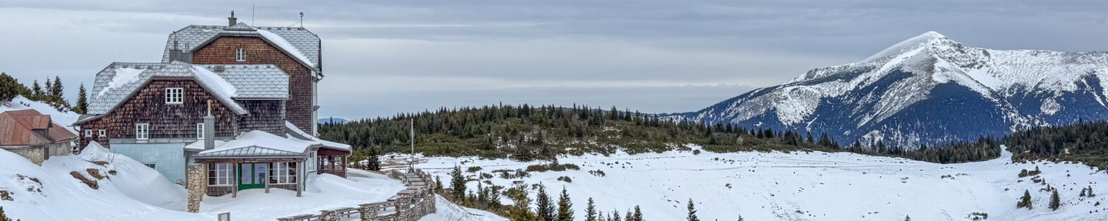 Wir erreichen das Otto-Haus und besteigen den Jakobskogel. Weiter geht es zur Bergstation der Rax-Seilbahn. Nix los, weit und breit. Leider ist auch die Menüauswahl sehr eingeschränkt.