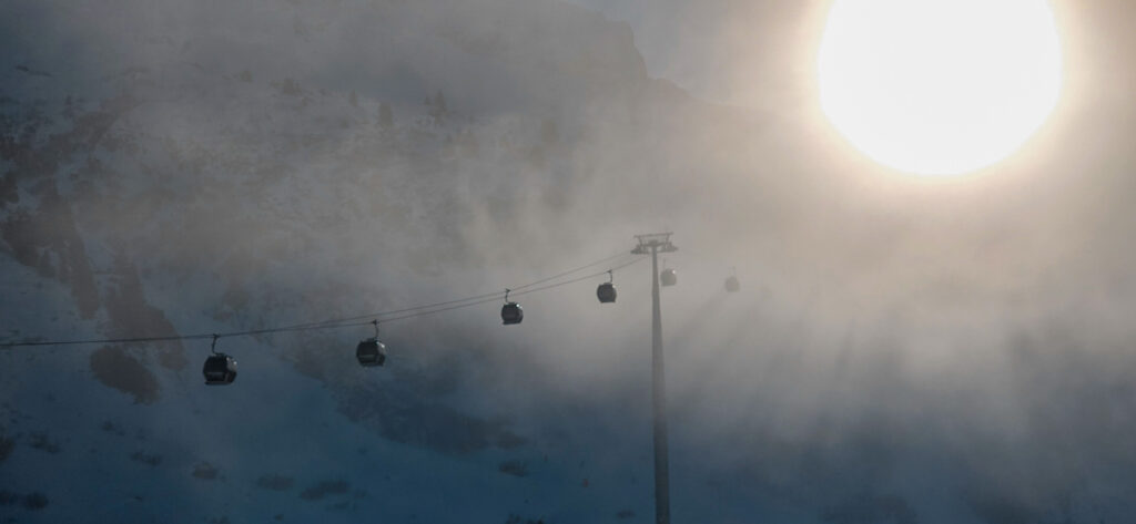 Ja, am Schnee mangelt es. Kein Vergleich zum vorigen Jahrhundert. In Lech kämpfen die Schneekanonen wie verrückt unter Einsatz von Strom, der durch die Verbrennung fossiler Brennstoffe gewonnen wurde, gegen die Auswirkung der Verbrennung fossiler Brennstoffe. So richtig nachdenken sollte man da nicht! Bei Sturm ist Lech übrigens schnell abgeschnitten. Okay, man kann noch mit dem Bus nach Zürs fahren.