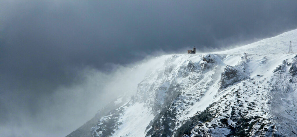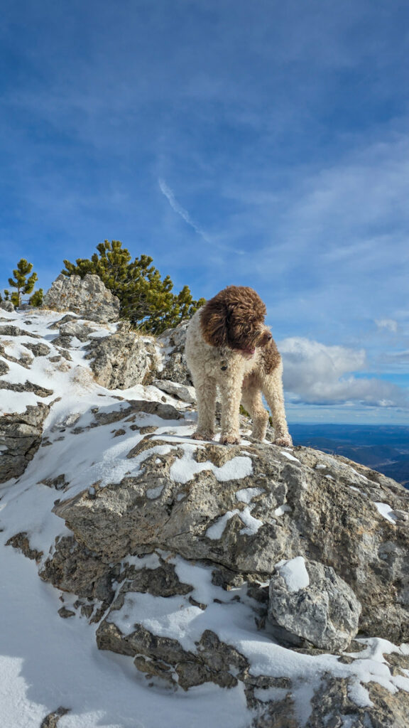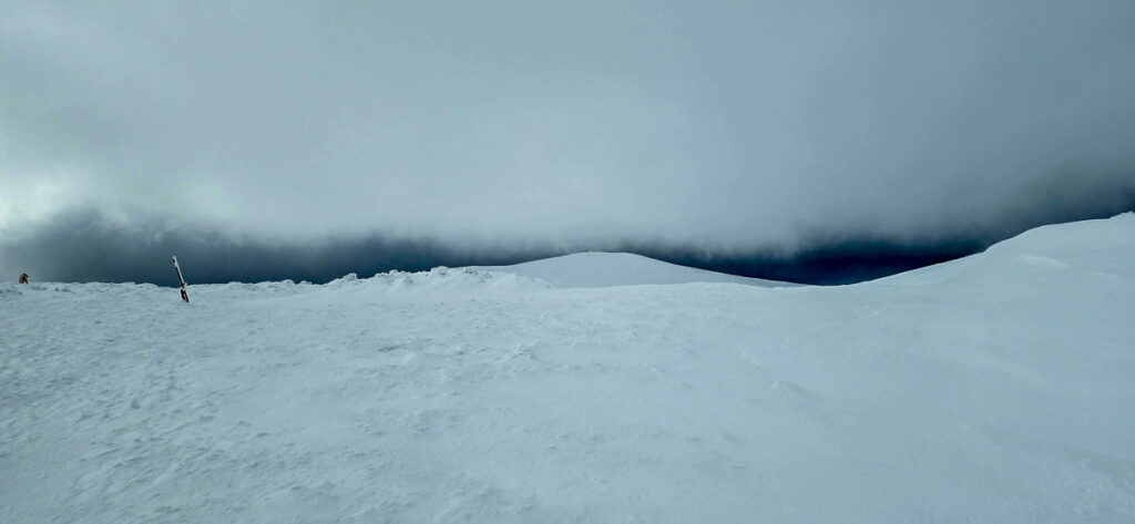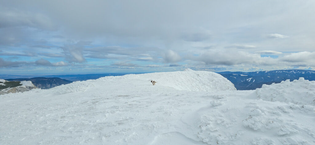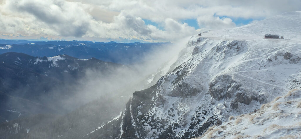 Blickt man zur Preinerwand, sieht man schon reichlich blauen Himmel. Blickt man zur Heukuppe, drängt sich ein „Na, servas!“ auf. Die Fotos zeigen es. Wir steigen weiter auf. Auf der Leeseite des Grates ist es nicht wild. Beim Einstieg des Bismarcksteiges kommt der Wind. Nur noch geschätzt 80 Höhenmeter unter dem Gipfel setzt ein Inferno light ein. Ich halte mich vom Grat fern. Wenn eine Böe kommt, die noch ein bisserl mehr Kraft hat, haut es mich da runter. Mio muss auf sich selbst achten. Anfangs findet er es noch lustig, aber die bodennahen Eiskristalle, die der Sturm entgegenschleudert, werden ihm zu viel. Er flüchtet in den Langermanngraben. Ich folge und dort wird es auch erträglicher. Wir schaffen den Gipfel, und ich schieße ein paar Fotos.