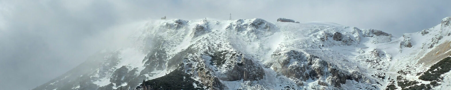 Blickt man zur Preinerwand, sieht man schon reichlich blauen Himmel. Blickt man zur Heukuppe, drängt sich ein „Na, servas!“ auf. Die Fotos zeigen es. Wir steigen weiter auf. Auf der Leeseite des Grates ist es nicht wild. Beim Einstieg des Bismarcksteiges kommt der Wind. Nur noch geschätzt 80 Höhenmeter unter dem Gipfel setzt ein Inferno light ein. Ich halte mich vom Grat fern. Wenn eine Böe kommt, die noch ein bisserl mehr Kraft hat, haut es mich da runter. Mio muss auf sich selbst achten. Anfangs findet er es noch lustig, aber die bodennahen Eiskristalle, die der Sturm entgegenschleudert, werden ihm zu viel. Er flüchtet in den Langermanngraben. Ich folge und dort wird es auch erträglicher. Wir schaffen den Gipfel, und ich schieße ein paar Fotos.